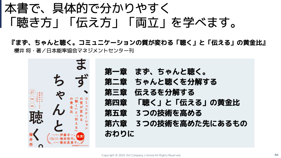 これはエールの代表の櫻井(将)さんが『まず、ちゃんと聴く。』という本を出していて、この本から抜粋しています。なので、より深く知りたいなっていう時は、本を見ていただけるといいかなと思います。