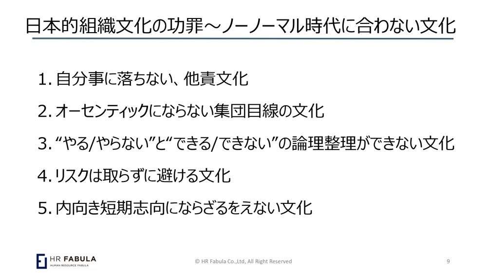 山本紳也氏:ネガティブから入りたくないんですが、ちょっとこれはストーリー性がなくていろいろ突っ込んでいますけれども。「日本企業の日本的組織文化」と書いていますが、僕が日本企業で気になることをバッと並べてみた感じなんですね。