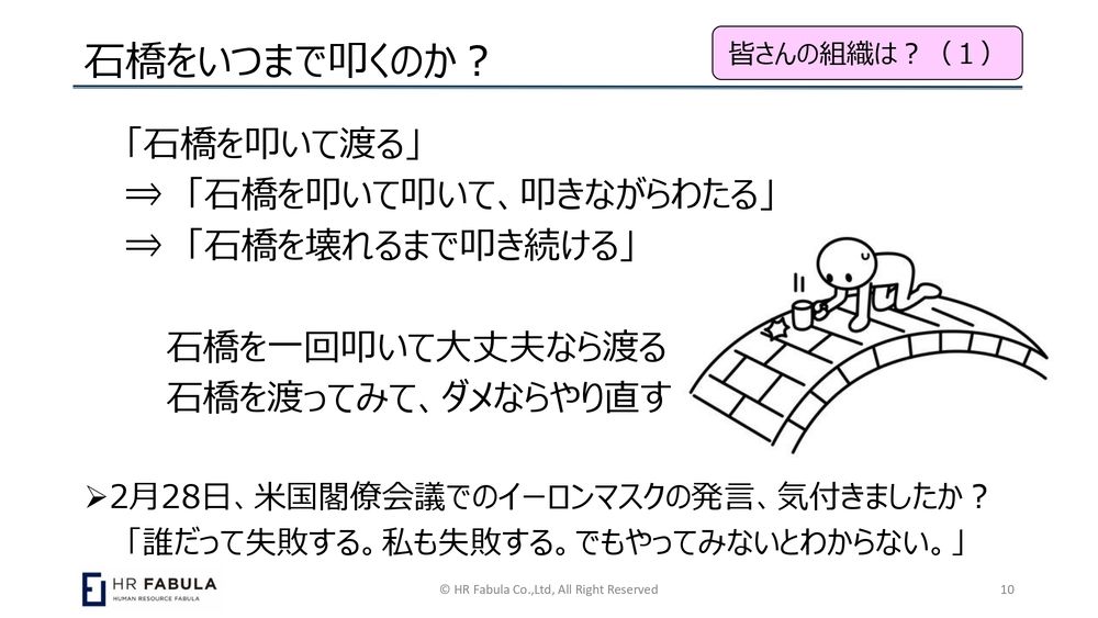 ダラダラしゃべっていますけどもうちょっとこの話をすると、これはみなさんの会社では何て言います? 「石橋を叩いて渡る」と似たような言葉はあります?