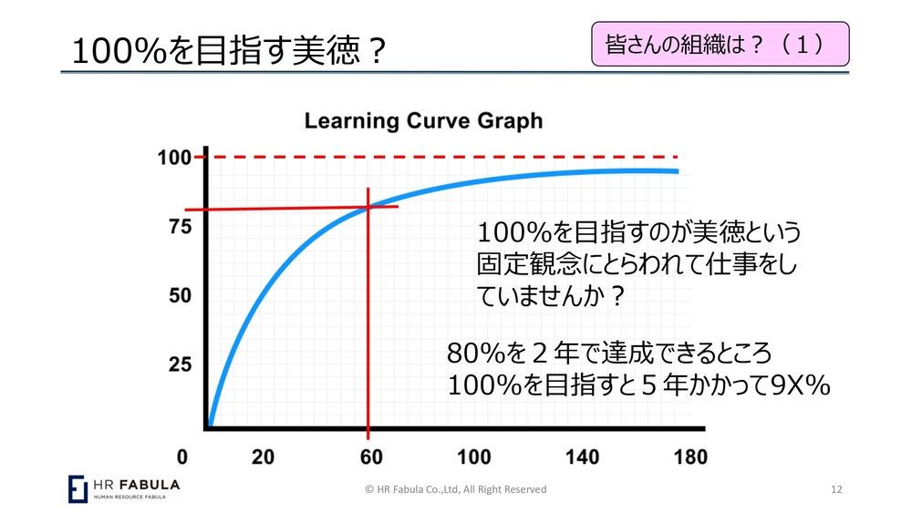 世の中はだいぶ変わってきていますけれども、ラーニングカーブってそうですよね。人事の方々はよくご存じのラーニングカーブというものは、だいたい8割方できるまでに40パーセントぐらいの時間が必要で、100パーセントまで持っていこうと思うと100パーセントの時間が必要ですよと。
