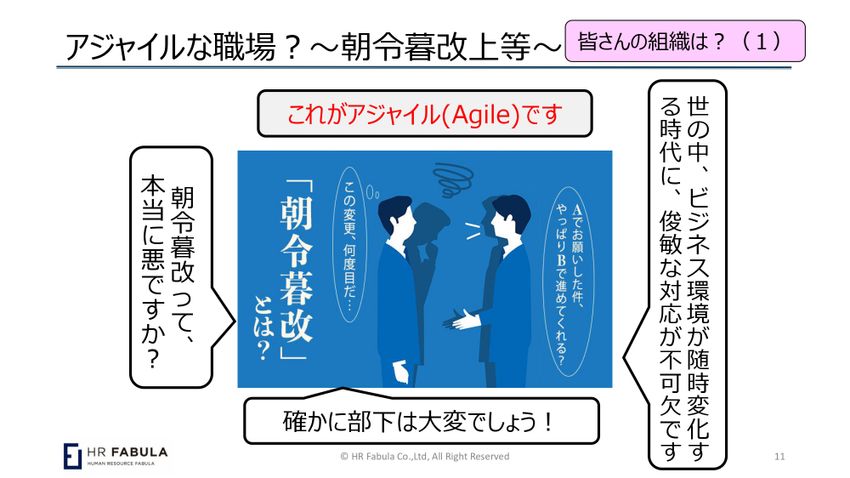 「朝令暮改、上等」と僕はどこかに書いていて、「この言葉、使っているし、大好き」という人たちが何人か来ていますけども。だって世の中の環境は変わるんだから、変わらなきゃダメじゃんという話じゃないですか。