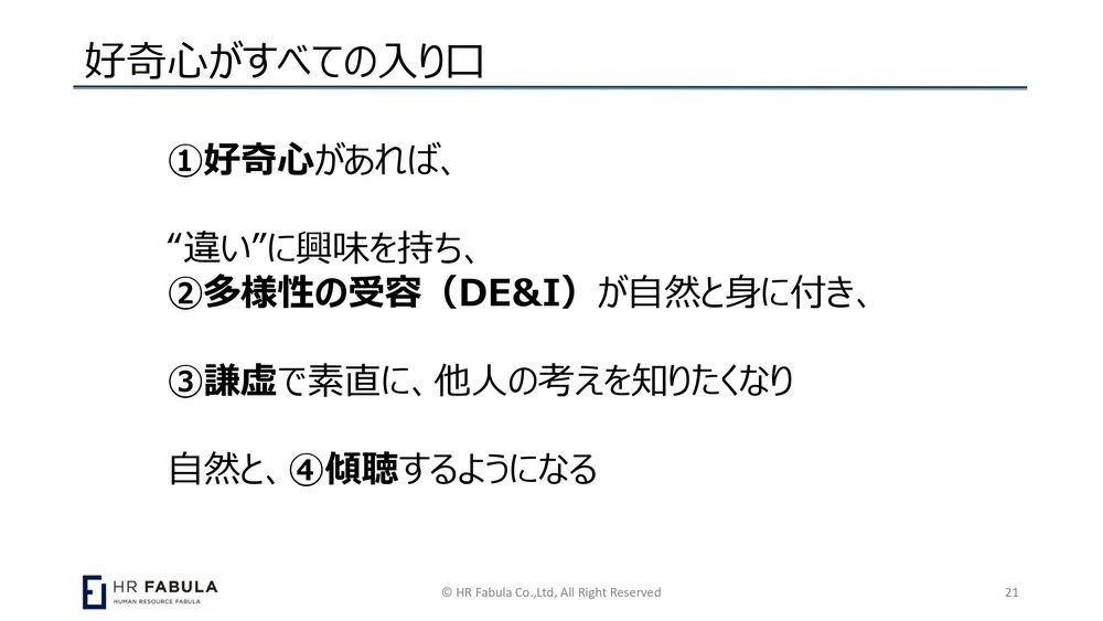 聞いて初めて部下の考えていることがわかるわけだし、「聞いてもらえている」と部下が思うかどうかが大きいわけですよね。上司、部下というよりも同僚でいいんですけども。やはりその場を作っていくのは大事かなと。入り口はこの好奇心……よく「部下に興味を持て」とか言うじゃないですか。「どうやって興味を持てばいいんですか?」とかみんなすぐ言うんですけれども。