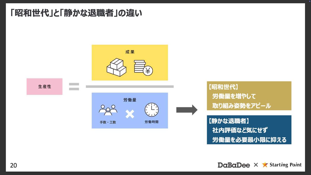 さらにもう1つ、昭和世代と「静かな退職者」の大きな違いとして、「生産性」に対する考え方があります。