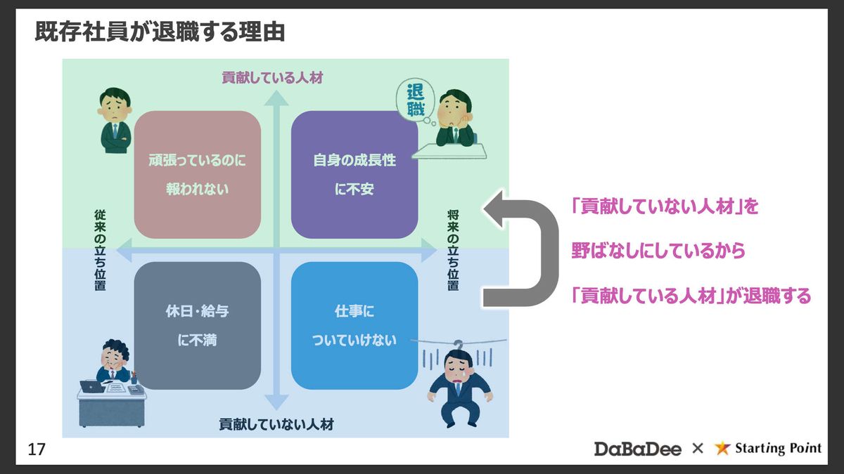 ただ、ここで1つの構造的な問題が生じます。パフォーマンスが低いままの人たちが残り続けると、逆に、パフォーマンスの高い人たちが「自分はこのままでいいのか」「この会社で成長できるのか」と悩み、先に辞めてしまうといったことが、多くの企業で実際に起こっているのではないかと思っています。