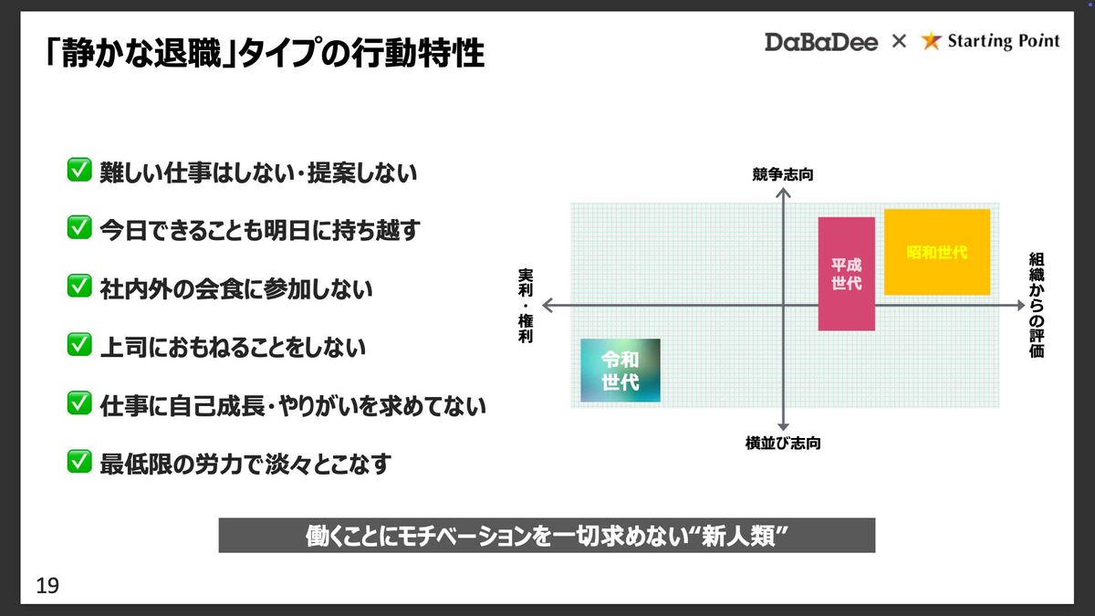 こうした状況をまとめると、もはや「働くことにモチベーションを求めていない新人類」と言ってもよいかもしれません。そして、ここに大きな問題があると考えています。