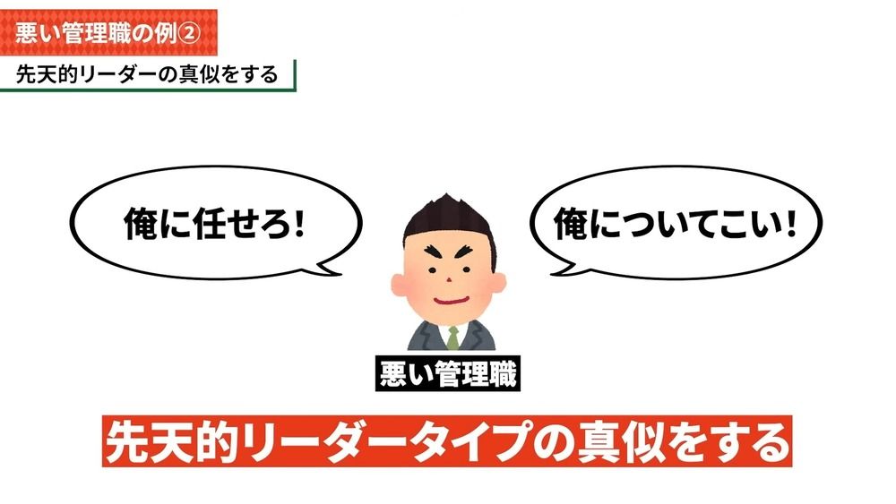 木下勝寿氏(以下、木下):次ですね。「悪い管理職の例 その②」を説明したいと思います。「先天的リーダーの真似をする」ということですね。社会人になってから、初めてリーダーを経験する人というのは、そもそもリーダータイプではないんですね。先天的なリーダーではありません。これはサブリーダーとかを含まずに、本当のリーダーだと思ってください。