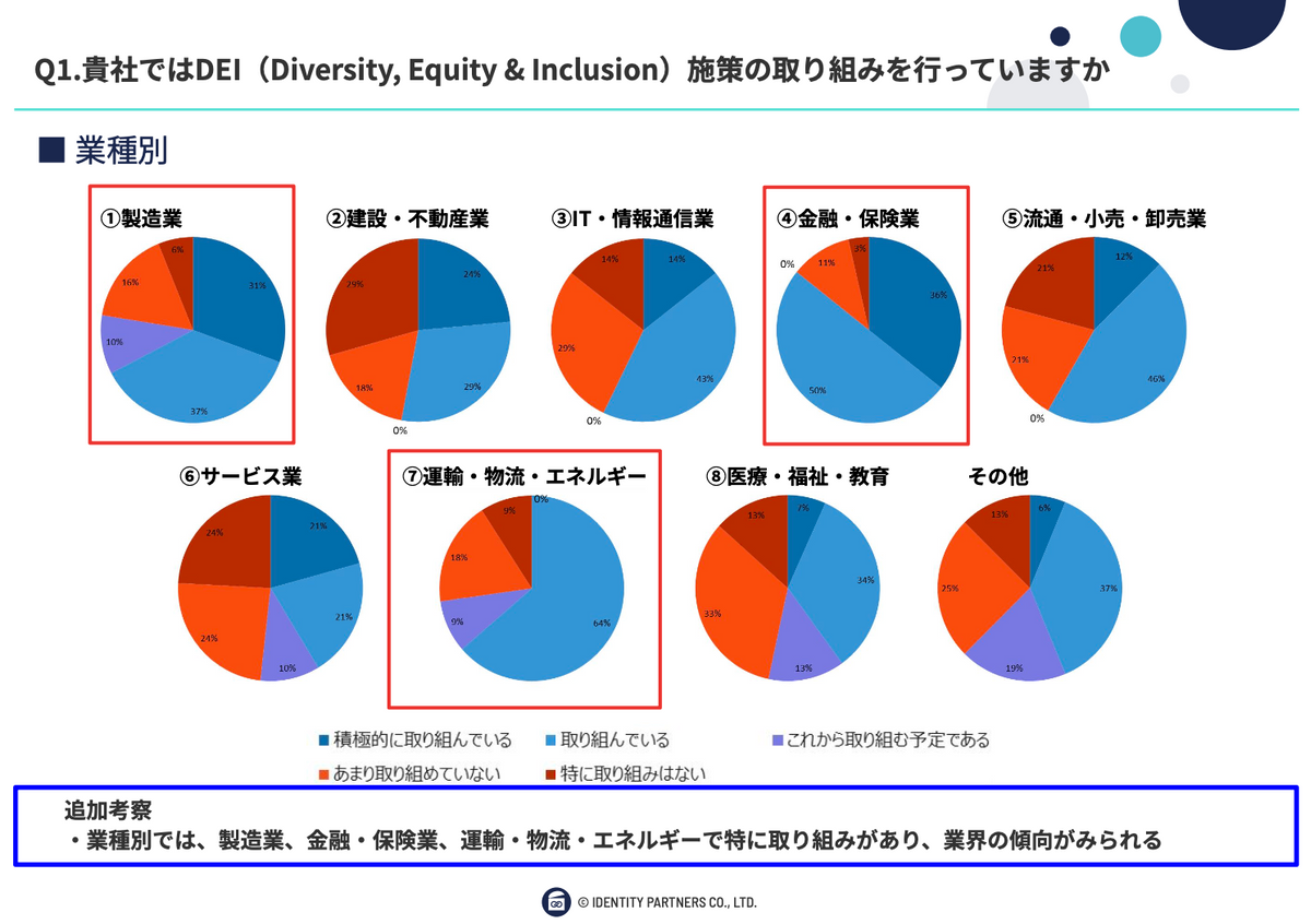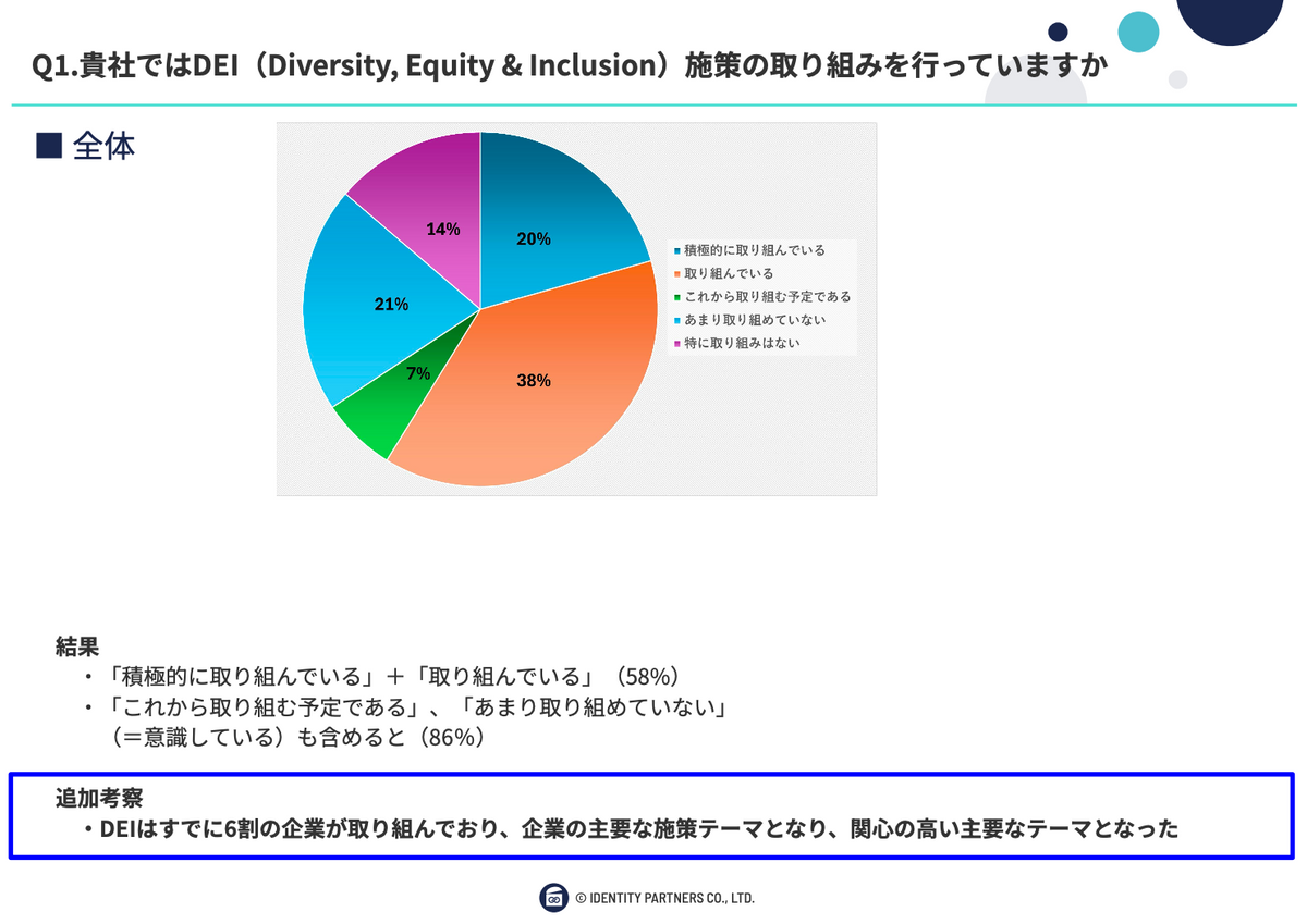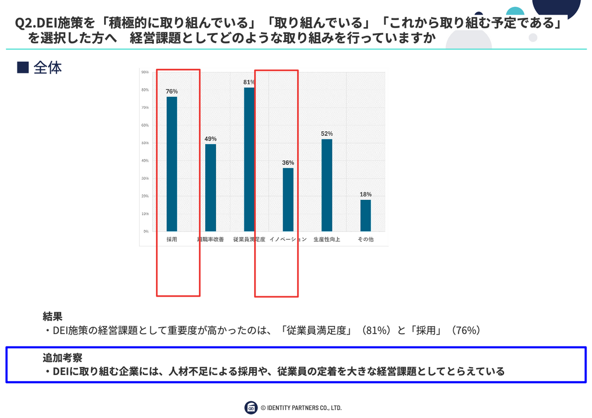 ということで、おそらく業界によって大小が変わってくると思います。DEIの取り組みや、ビジネス環境が違ってくるので、もしかしたらみなさまの業界とか、あるいは組織の中でDEIがどう位置付けられているかが問われた部分があるかなと思います。