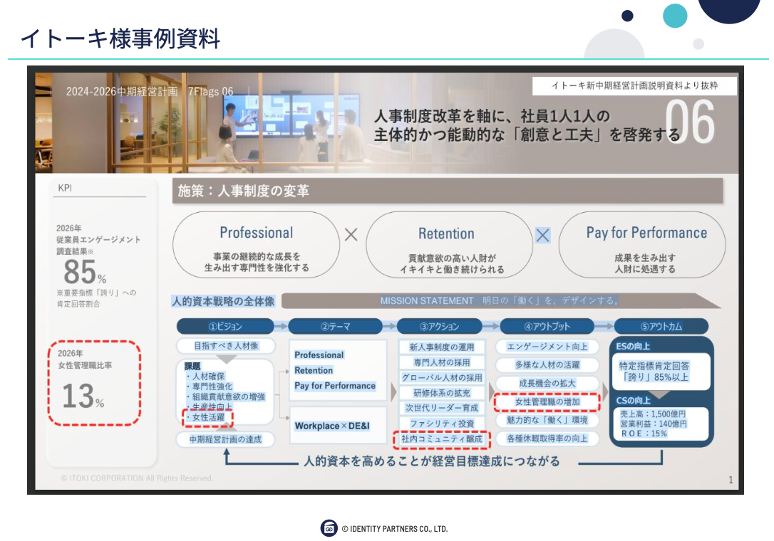 当社は今、2024年から中計(中期経営計画)が走っておりまして、今2025年なので2年目が始まったところです。その中の「7Flags」の1つの柱として人的資本経営を掲げております。これは対外的にも公表している資料なので、ご興味があれば見ていただけたらなと思います。