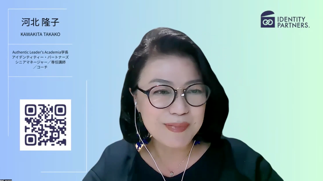 私、アイデンティティー・パートナーズ株式会社、オーセンティックリーダーズ・アカデミアというビジネススクールの学長を務めております、河北隆子と申します。どうぞ名前と顔を覚えていただければうれしいです。