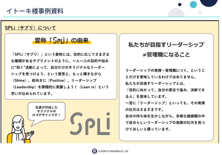 アイデンティティー・パートナーズ株式会社主催イベント「ダイバーシティサミット-session1」より、株式会社イトーキの女性限定コミュニティ「SPLi(サプリ)」の取り組みを紹介します。女性社員が主体となって立ち上げたコミュニティが、どのように組織の課題解決につながっているのか。多様性施策を推進する現場の実例として、その具体的な活動内容と成果を報告します。