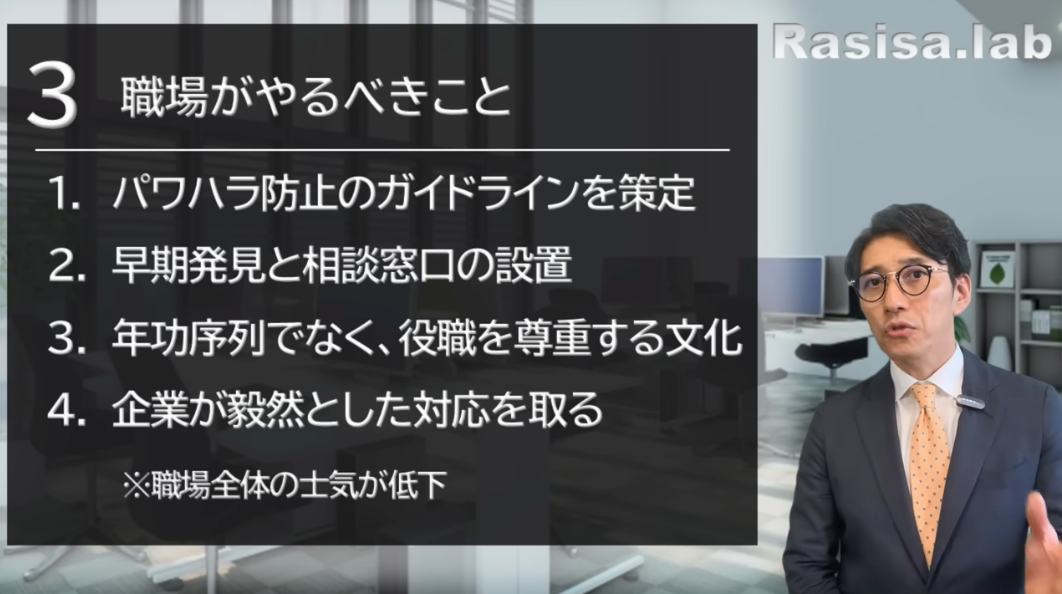 4つ目。企業が毅然とした対応を取る。じゃないと、職場全体の士気が下がるからです。今回、この会社さんはすごくいいと思いました。僕自身は「君ががんばれ」と言われましたね。実はその3ヶ月から6ヶ月の間、私の担当職場の士気が下がっていました。