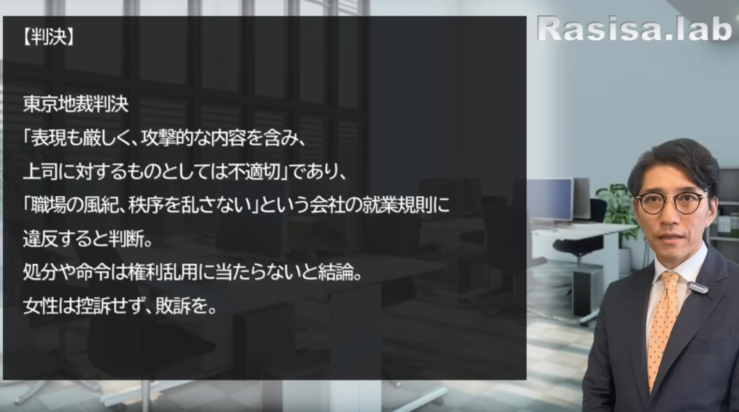 それに対して裁判を起こしたもののどうなったかというと、東京地裁の判決は、その女性に対して「あなたが負けです」と言ったわけですよ。「表現も厳しく、攻撃的な内容を含み、上司に対するものとしては不適切であり、職場の風紀、秩序を乱さないという会社の就業規則に違反すると判断。処分や命令は権利濫用に当たらない」と結論付けました。女性は控訴せず、敗訴が決定しました。