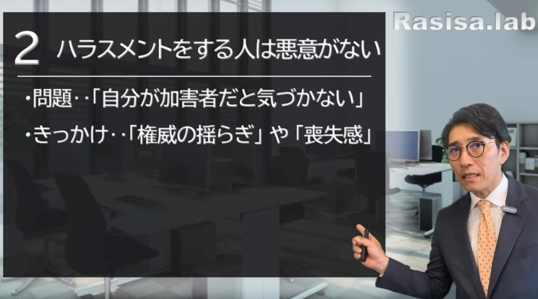 さぁ、そう考えた場合にまず、なんでよかれと思いながらハラスメントに至ったのかを見てみましょう。ドン。ハラスメントをする人って悪意がないんですよ。問題は、自分が加害者だと気づいていないことです。ほとんどのハラスメントはそうですよ。