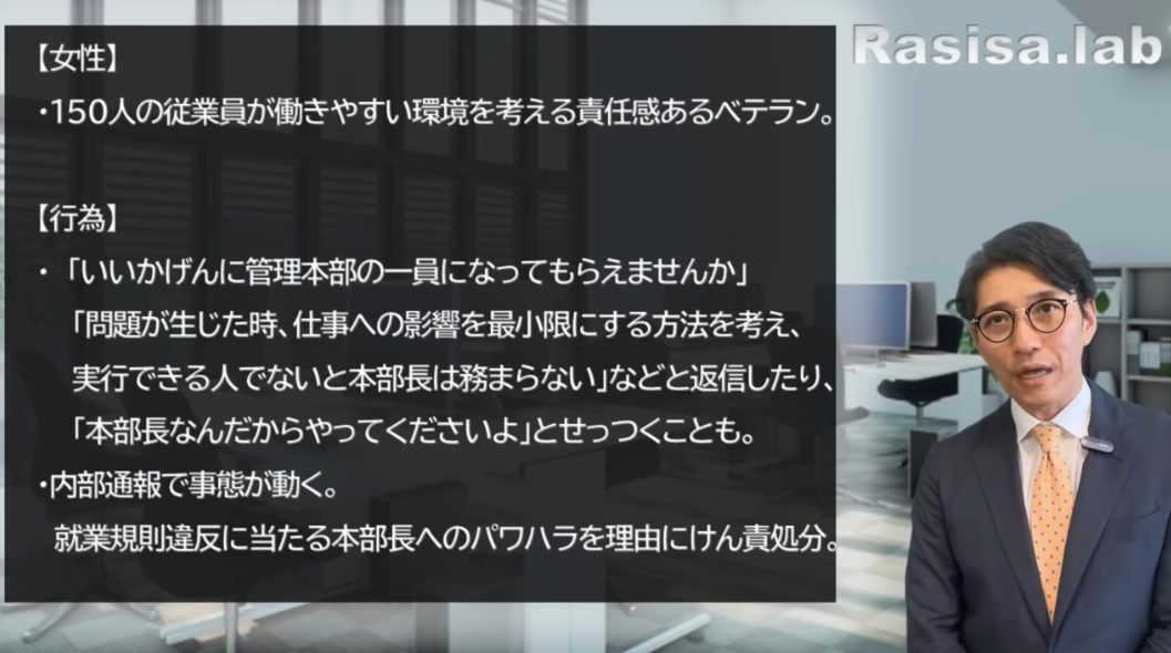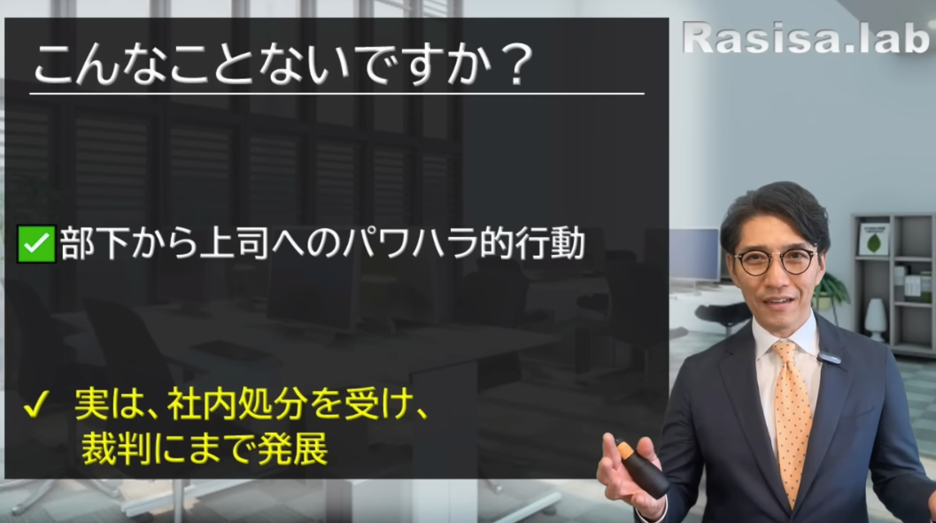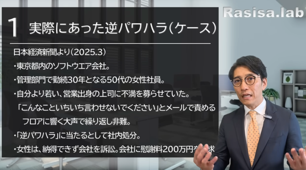 もちろん私はそれを自力で解決しましたが、余計なパワーをかけたくないですよね。さぁ、今日は上司に朗報かもしれません。ドン。最新のトピックスです。(スライドの)このケースで逆パワハラをしたある会社の女性ベテラン社員は社内処分を受け、裁判にも発展しました。さて、その裁判でどうなったんでしょうか? 上司は必見です。これから強く出ていただけると思います。