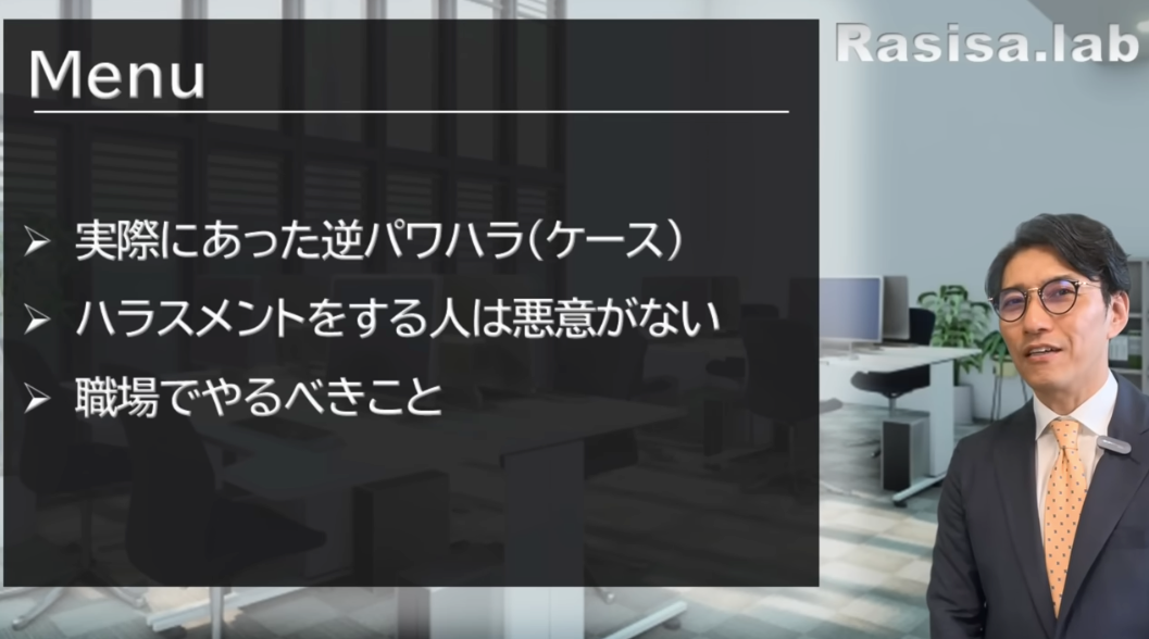 メニューはこちらです。今日のトピックスでは、実際にあった逆パワハラのケースを紹介します。日経新聞に載っていました。そして実はハラスメントをする人には悪意が無いから、やる側の本人も気の毒なんですね。悪意がないんです。助けてあげましょう。そして職場でやるべき対策を紹介していきます。