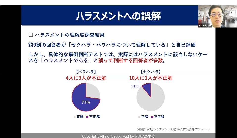 セクハラはさすがにというところで(不正解率は)10分の1ぐらいなんですが、パワハラに関してはなかなか線引きが難しく、約4人に3人から不正解の結果が戻ってくるというのは、我々が研修を実施している中でも実情としてございます。