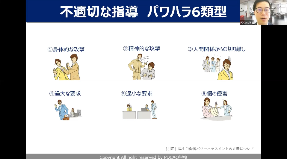 そもそもパワハラとは何ぞや? というところなんですが、これは厚労省が実際に発表しているもので、1から6まで6類型でまとめてあります。1つ目が、身体的な攻撃。2つ目が、精神的な攻撃。3つ目が、人間関係からの切り離し。4つ目が、過大な要求。5つ目が、過小な要求。6つ目が、個の侵害です。