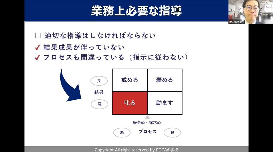 とはいえ、業務上必要な指導はあるかと思いますし、適切な指導はやらなければいけないかと思います。叱る基準を定義付けをさせていただきますと、結果・成果が伴っていない、かつプロセスも間違っている。要はやり方ですね。