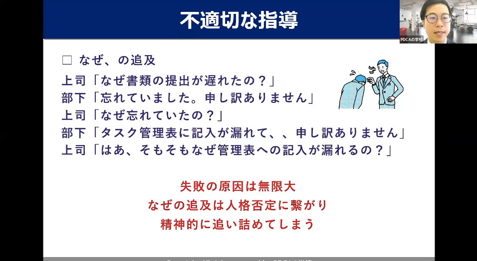 そんな中で「なぜ? なぜ?」で追及してしまうと、最終的には人格否定につながってしまって、厚労省が発表している(パワハラ)6類型の「精神的な攻撃」に該当する恐れがあるので、精神的に追い詰めてしまう可能性がありますよというところです。