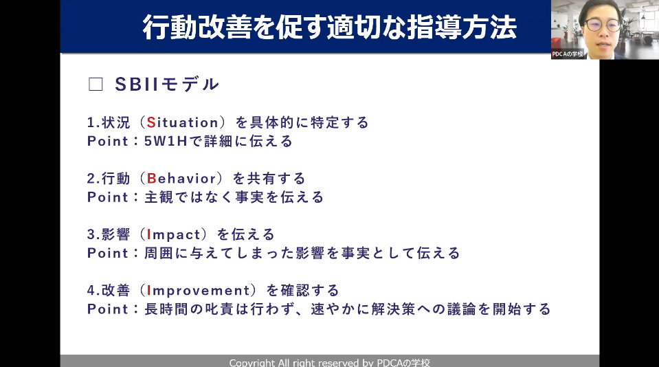 本人の行動改善を促す適切な指導方法としては、SBIIモデルがいいのではないかなということでお持ちした次第です。もともとは「SBI」というモデルだったんですが、アメリカかどこかの研究チームが発表した理論なんです。