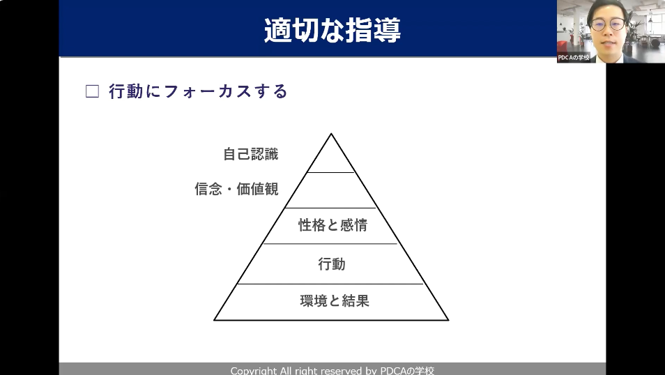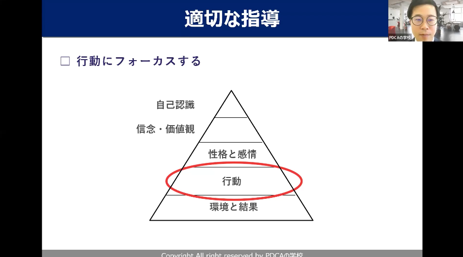 みなさまもどこかで似たような話を聞いたことがあるのではないかなと思うんですが、このピラミッドをもとに解説をさせていただきますと、叱る際、指導する際にフォーカスすべきは行動です。間違った行動を取っていたのであれば、行動にフォーカスして叱る。行動をベースに叱るということが大事になってきます。