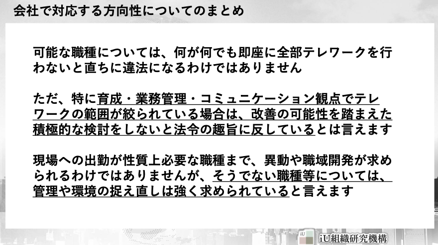 なので、とにかく環境改善をしていければ解決する問題も多い。こういう経営的意見に対して、テレワークの方法や管理上の工夫が足りないだけかもしれないということを会社で浸透させることが必要ですし、この観点でもって戦略的に検討することが促されている法令なわけです。そこを捉えて、経営観点でどうするかの方針を決定するのがすごく重要じゃないかと思います。