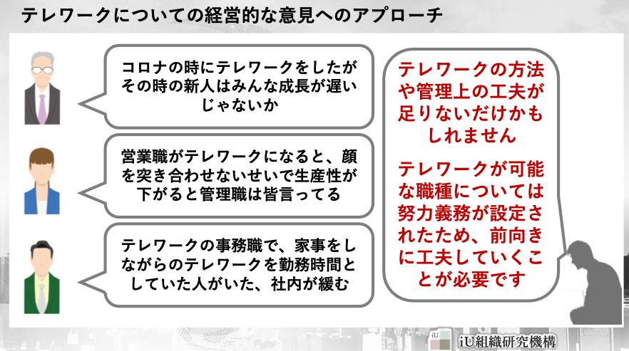 例えば「コロナの時にテレワークをしていたけど、成長が遅くなった」とか、経営的な意味で、今の現象だけを見て多様な働き方をあんまり進めたくないという意見がすごくたくさんあるんだと思うんですけど。