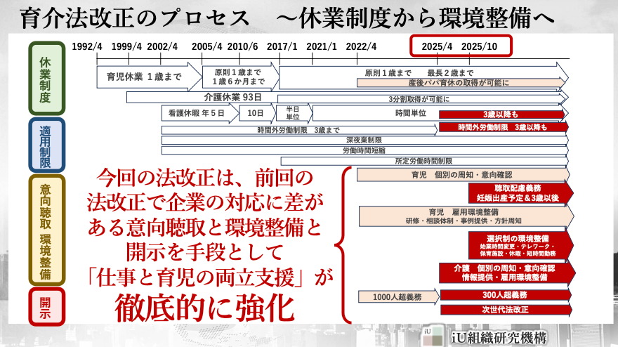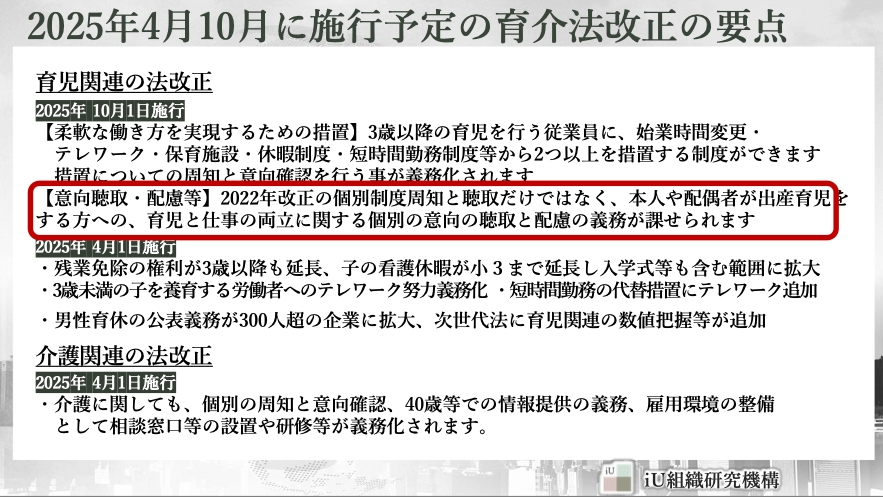 そもそも育介法は何回も改正があるんですけれども、基本的には休むための法令だったんですよね。それが前回から、休むことだけじゃなくて、より休みやすくする環境整備とか、育児と仕事をよりしっかり進めるところの趣旨が出てきて、今回の改正もこれということです。
