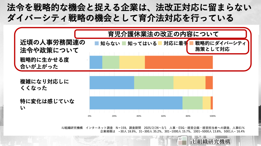 まず左側の縦軸のところで、そもそも「近頃の人事労務関連の法令や政策は戦略的に活かせる度合いが上がったな」と考えている企業さんでは、今回の育介法の改正をダイバーシティ施策の戦略的なものの1個のパーツとして使う意識でやっていて、そこの意識差が企業によってものすごく強いんですよね。