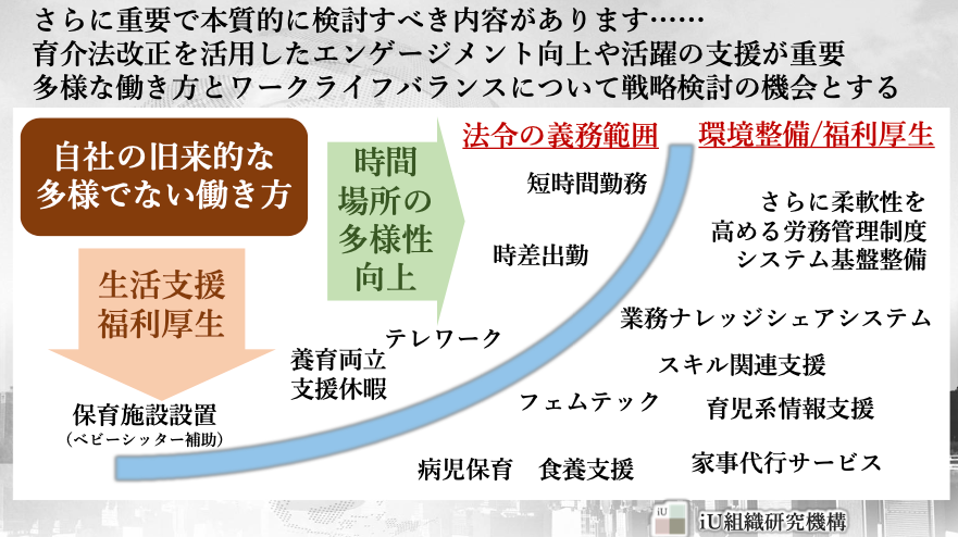 かつ、育児・介護、特に育児は対象者が特殊で多いので、じゃあ、どういうことをすればいいかと考える。特に今回の法令は2つがマストみたいな話がありますから、その中でどういうふうに適合させるか。この順番で考えないと、よくわからない話になるんですね。