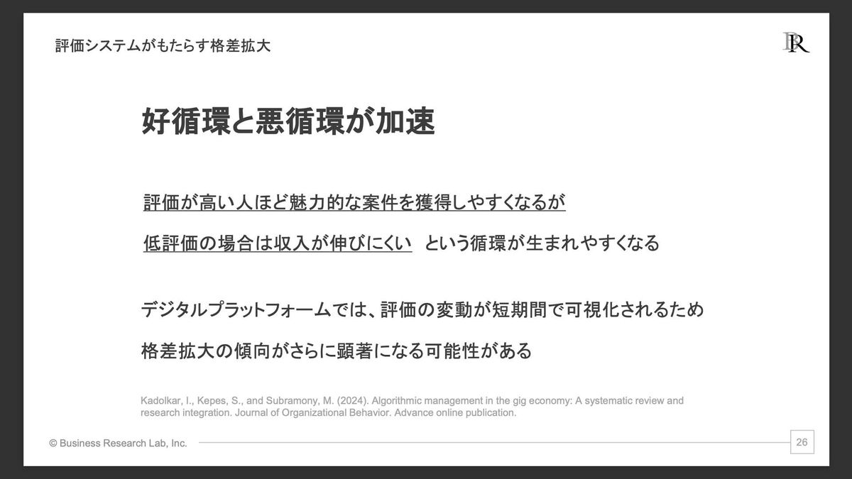 裏を返せば、その逆もある。評価の低い人は、魅力的な案件にアクセスしづらくなり、結果として収入が伸びにくくなる。つまり、二極化、格差が拡大していく可能性があるということも、アルゴリズム管理のもとでは指摘されているわけです。