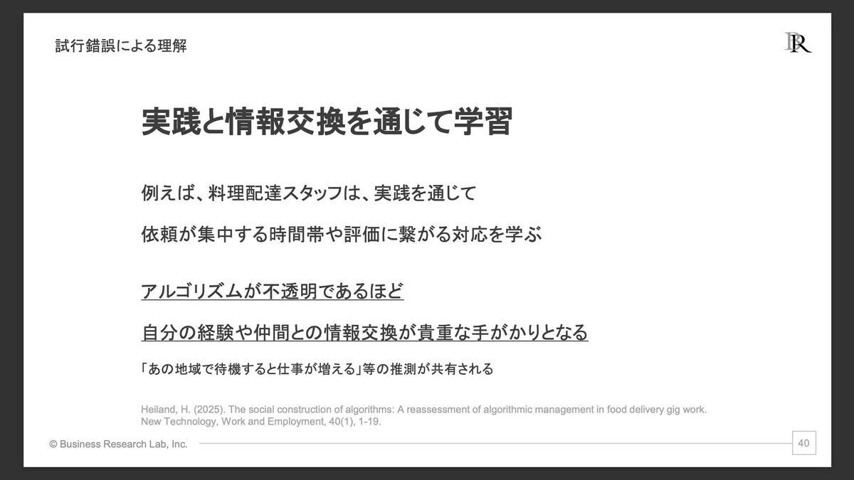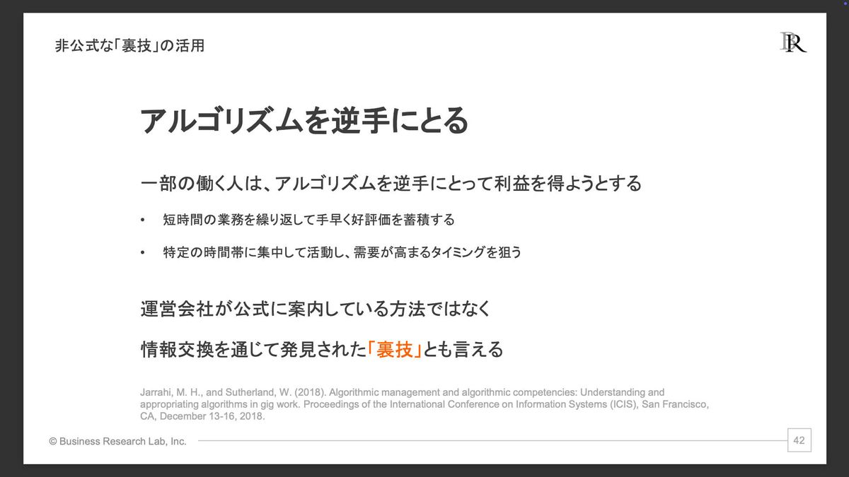 そういった意味で、アルゴリズム管理というのは、働く人にさまざまな制約を課す仕組みでもあるのですが、同時に“攻略すべき対象”にもなりうる。それが非常に興味深い点だと思います。