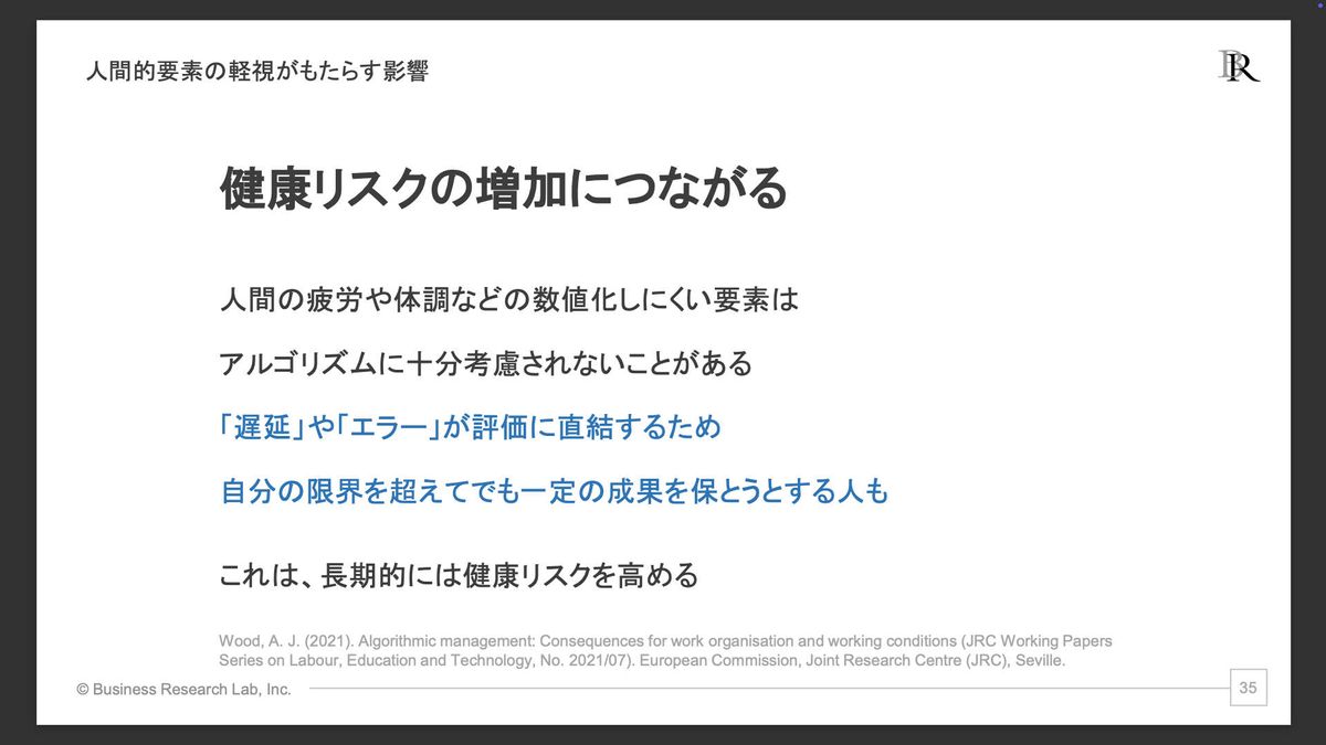 こうした人間の疲労や体調といった部分は、現時点では必ずしも完全に数値化されているわけではありません。つまり、アルゴリズムは人間の体調を考慮することなく、次々と指示を出してくる。その指示に対して、成果ベースで評価をしていくという仕組みが成り立ってしまう可能性があるわけです。