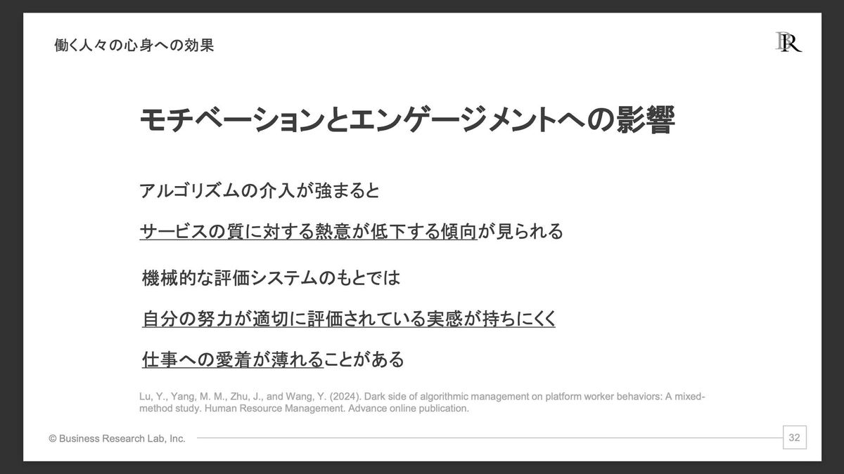 組織課題を丹念に読み解く調査&コンサルティング会社「ビジネスリサーチラボ」が開催するセミナー。今回は「AIが変えるマネジメントの未来」をテーマとしたセッションの模様をお届けします。「アルゴリズム管理」がうまく機能しなくなる要因や、プラットフォームと働き手の“いたちごっこ”構造について語られました。