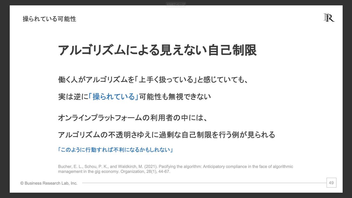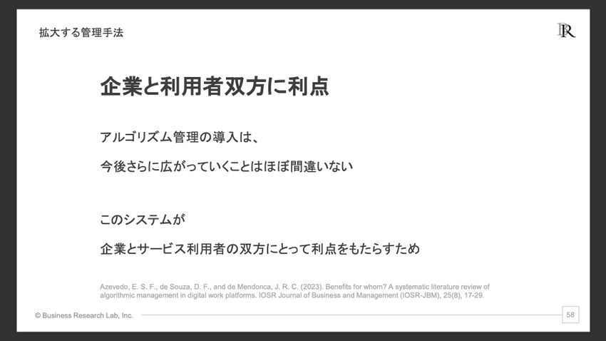 組織課題を丹念に読み解く調査&コンサルティング会社「ビジネスリサーチラボ」が開催するセミナー。今回は「AIが変えるマネジメントの未来」をテーマとしたセッションの模様をお届けします。企業がアルゴリズム管理の導入で得られるメリットについて語られました。