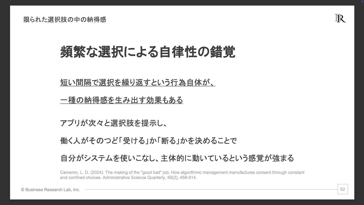 ただし、そういった状況でも頻繁に選択ができると、働く人は「自分は自律的に働けている」と、ある意味で錯覚してしまう可能性があるわけですね。言ってみれば、限られた選択肢の中で自己決定を繰り返している状態です。そしてこの構造自体が、アルゴリズム管理のある種の巧みさを示しているのではないかと思います。