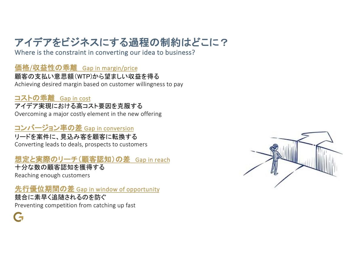 優れた価値をもたらす能力を構築するフェーズです。次の思い込みは「収益に結び付ける」フェーズに関連します。我々のすばらしいアイデアを技術や新製品に落とし込み、価値、収益をもたらすことができるでしょうか。