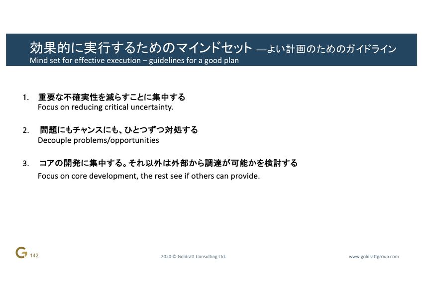 1つ目は「重要な不確実性を減らすことに集中する」。これが最優先であるべきです。どんなイノベーションでも、まず「何が分かっていないか」に着目するでしょう。一番重要な不確実性はどこにあるか?