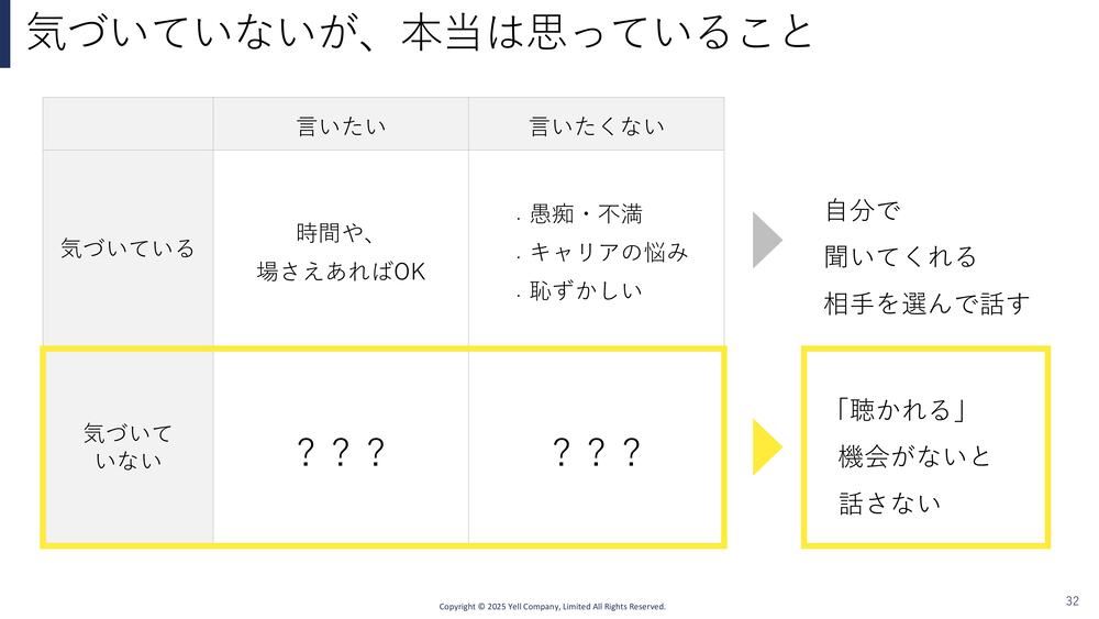 篠田:「本音を話してよ」とか、よく上司に言われたり仲間同士で言ったりするんですが、お互いにもう大人ですから、その人がすでに気がついてることは相手を選んだり、場を選んで言ったり言わなかったりするので、そこに踏み込むのははっきり言って失礼なんだと思うんです。
