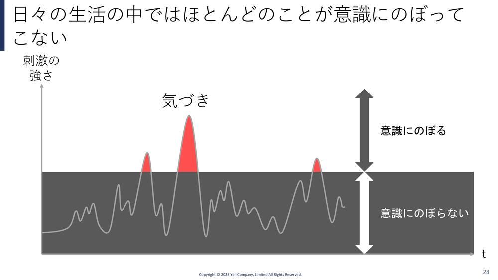 どういうことかというと、私たちは日々いろんな刺激を受けているわけですが、全部に注意を払うなんてことは到底できないので、無意識に線をバーンって引いていて、その上のことしか覚えてないし感じないんですよね。