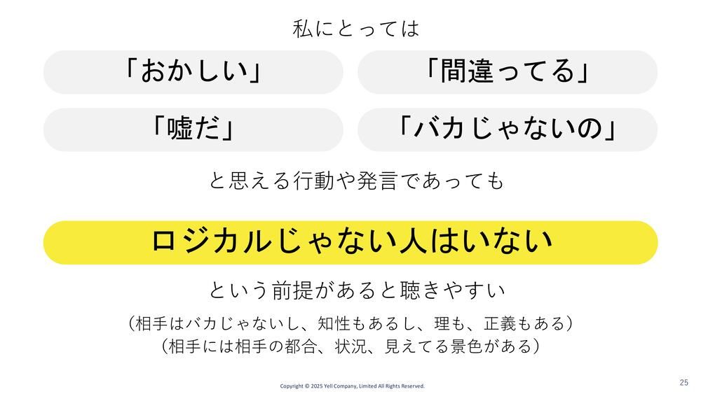 これは抽象的なのでさらに別の言い方をすると、私にとっては「おかしいな」「間違ってる」「嘘でしょ」とか、なんなら「バカじゃないの」「ぜんぜんわかってないな」と、一見思えちゃう発言や行動であっても、相手には相手なりの考えがある。その、あなたなりの考えをいったん教えてくださいねっていう態度です。