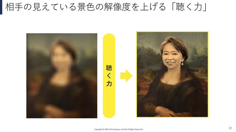 聴かないで早とちりして、「これは『モナ・リザ』だけど絵が下手ですよね」とか言っちゃうとwith judgement(聞く)、ここまで聴き切るのがwithout judgement(聴く)という感じです。