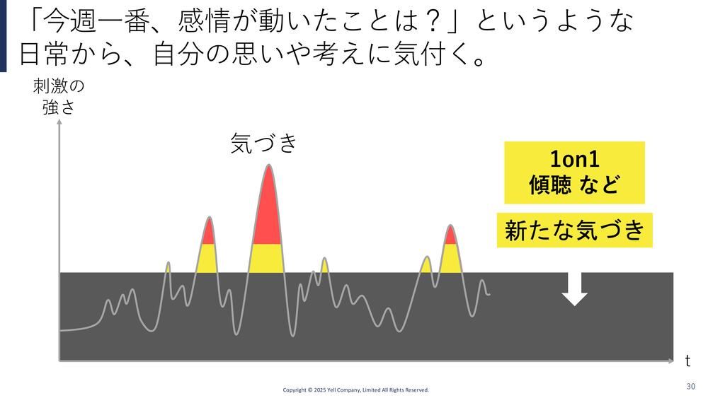 だけど、じっくり聴いてもらったりすると、イメージとしてはこの水平線がちょっと下がって(新たな気づきが)出てくる。だから、知らなかったわけじゃないんだけど、「言われてみれば、確かに自分は今週で一番感情が動いた」みたいに感情が動く。