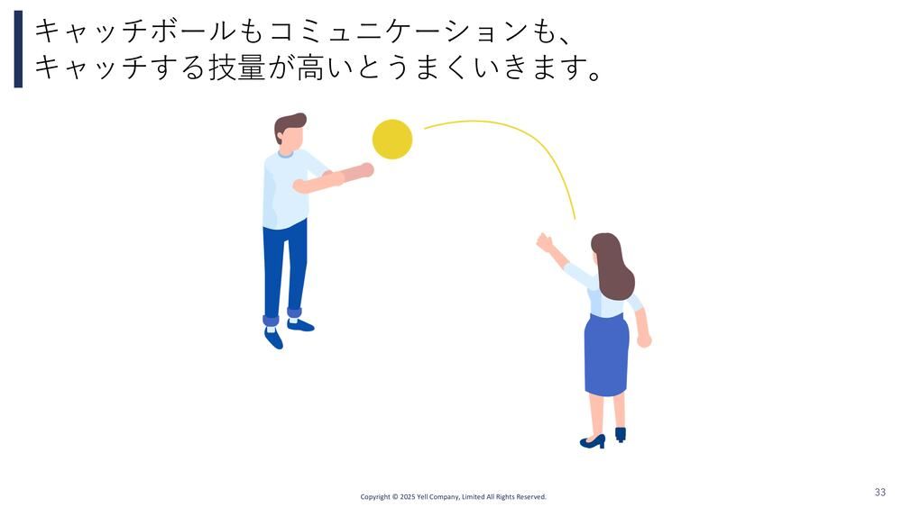 そのまんま(書籍から)転用していますが、キャッチボールに例えます。本当のキャッチボールをイメージしていただくと、投げるほうが上手だともちろんキャッチボールは続くけど、投げるほうが多少へなちょこでも、キャッチするほうがすごく技量もあって楽しそうにキャッチしてくれたら、キャッチボールって楽しく続きますよね。
