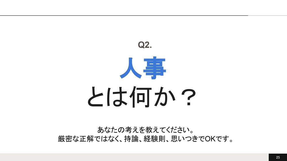 「人事って何でしょう?」。これも大きいワードですけど、ぜひオンラインの方たちはチャットに書いてください。会場のみなさんはお隣の方と、「人事とは何か?」についてぜひあなたの考えを(話し合ってください)。正解じゃなくていいですよ。定義じゃなくていいです。持論、経験則、思いつきでちょっと話してみてください。お願いします。