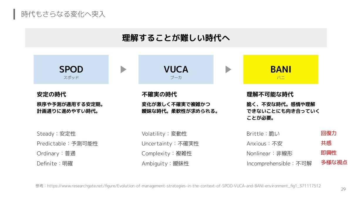 ちょっと前まではVUCAという、不確実な時代と言われていましたが、これからはBANI、理解不可能な時代に突入すると言われています。脆く不安な時代で、感情や理解できないことにも向き合っていくことが必要だと言われているのがこの時代です。