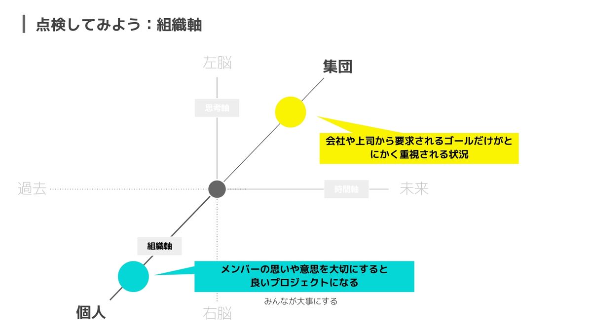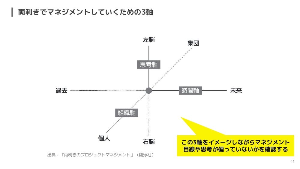 左脳は、例えば数値を重視して、合理的な管理も大事にするけど、だからといってメンバーの感情や思いがないことになってはいけないので、そういったところも大事にしながら進めていく。「今のウチのプロジェクト、雑談ばっかりになっているな」となったら、やはりちゃんと数値を重視して進捗が出ているか確認してくださいねというのが、この思考軸ですね。