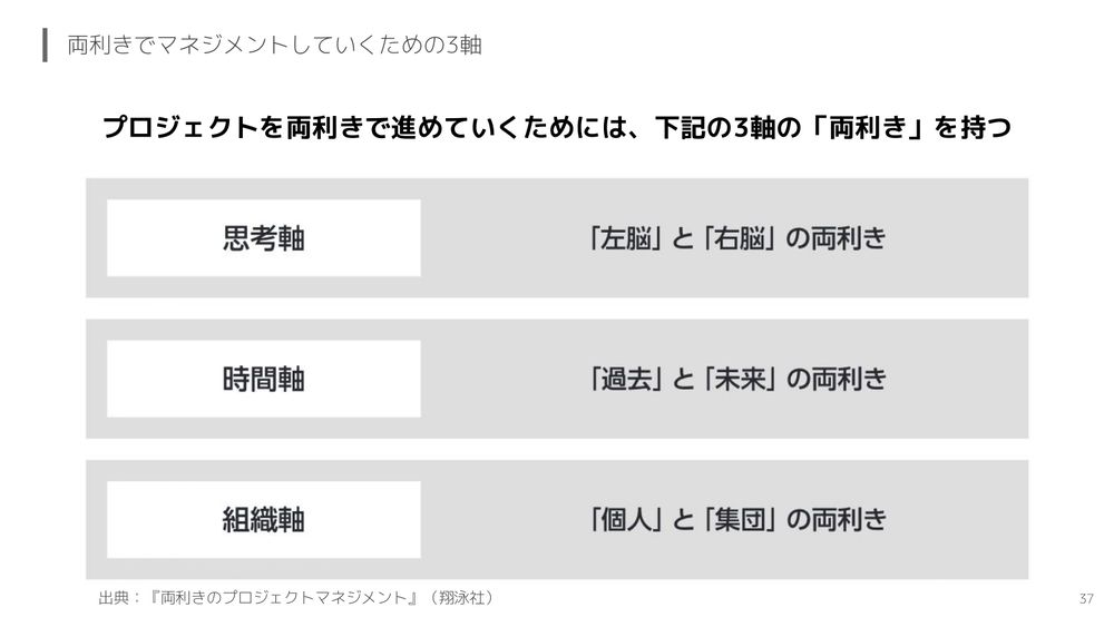 では実際にこの世界観の中で、両利きでプロジェクトマネジメントをするためにどういうものを使っていくのかというところで、まず3軸をご紹介したいと思います。