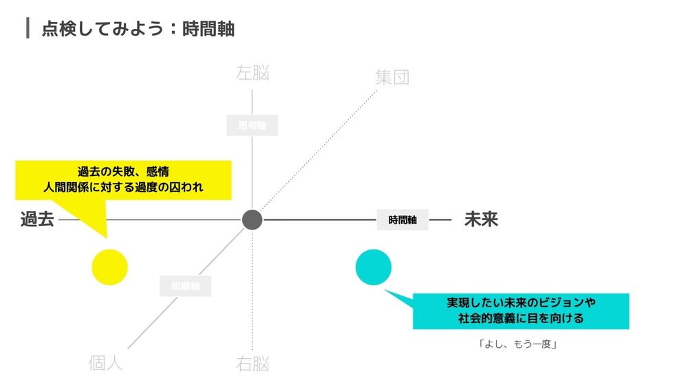 あと、その反対の極ですね。未来に行く。「一歩先の未来。これが進んだ後、どうなっていくんだろう?」という見通しを持って進めていくのも大事だし、「このプロジェクトが成功したあかつきには……」といったような、実現したい状態や成果を見ることで自分たちの意味を見いだせる。