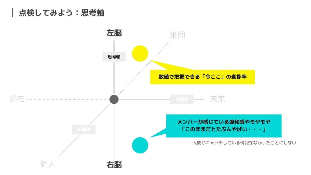 まず最初に思考軸。数値で把握できる「今ここ」の進捗率に目を向けるというのが左脳側ですね。思考軸の上のところです。もう1つ、右脳側に目を向けるとどういうことがあるか。メンバーが感じている違和感やモヤモヤをキャッチするというのを、もう1つの右脳側の例として挙げさせていただいています。